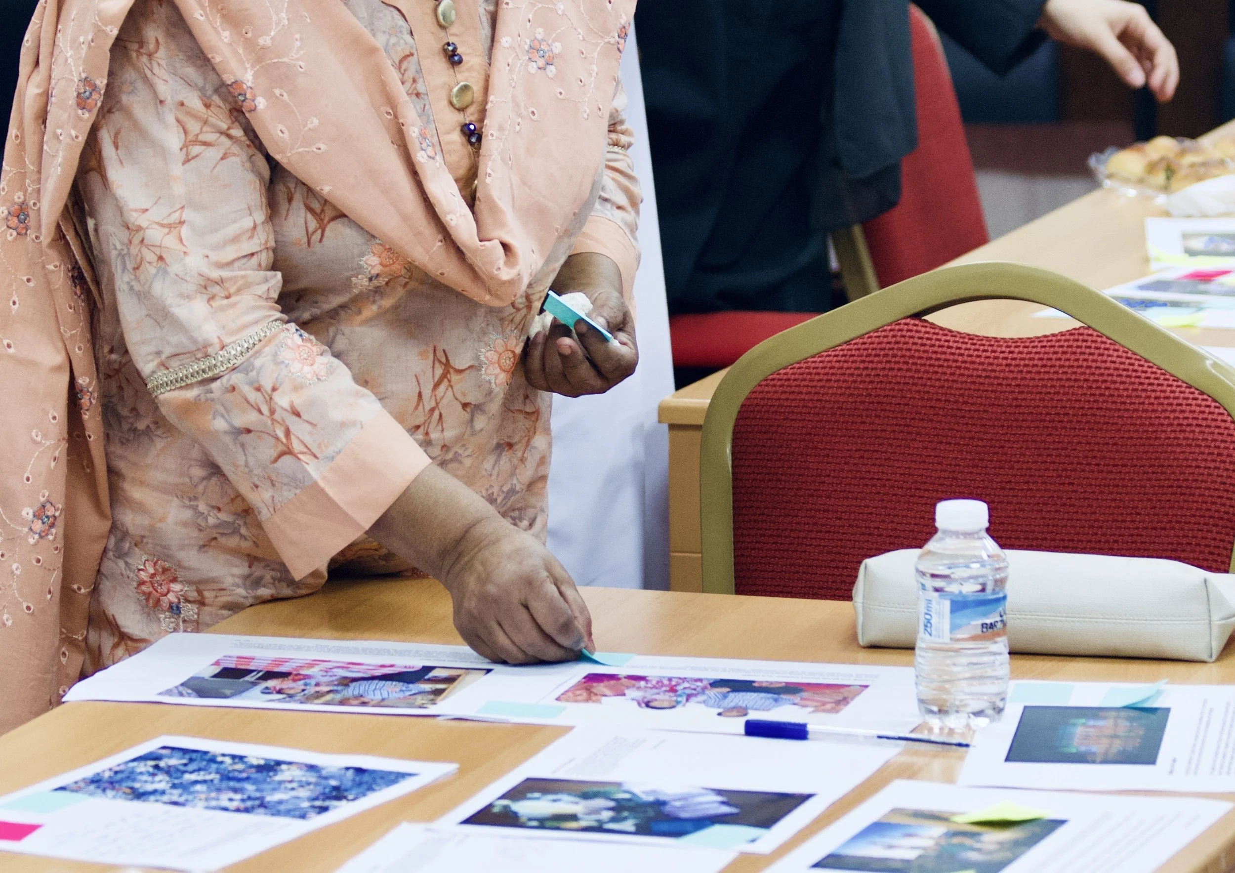 Our team arrived early to set up for our first meeting. Then we waited. I was anxious, worried about people not coming. My local partners assured me people were on their way. Eventually, people showed up for the meeting. Despite the angst I felt about starting late, the meeting went well. Muslims, Christians, and Hindus formed diverse small groups, shared their photographs and stories with one another. They learned about one another’s religious lives, spiritual experiences, and interfaith harmony in Oman, which was exactly what we intended.