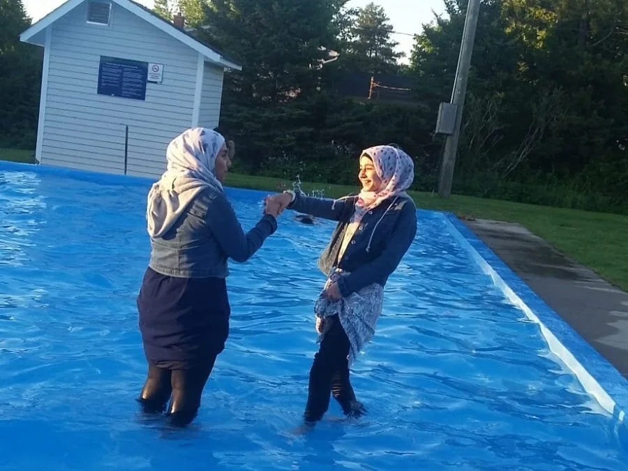 Photo 2. Salsabel and her friend splashing and laughing in a pool.